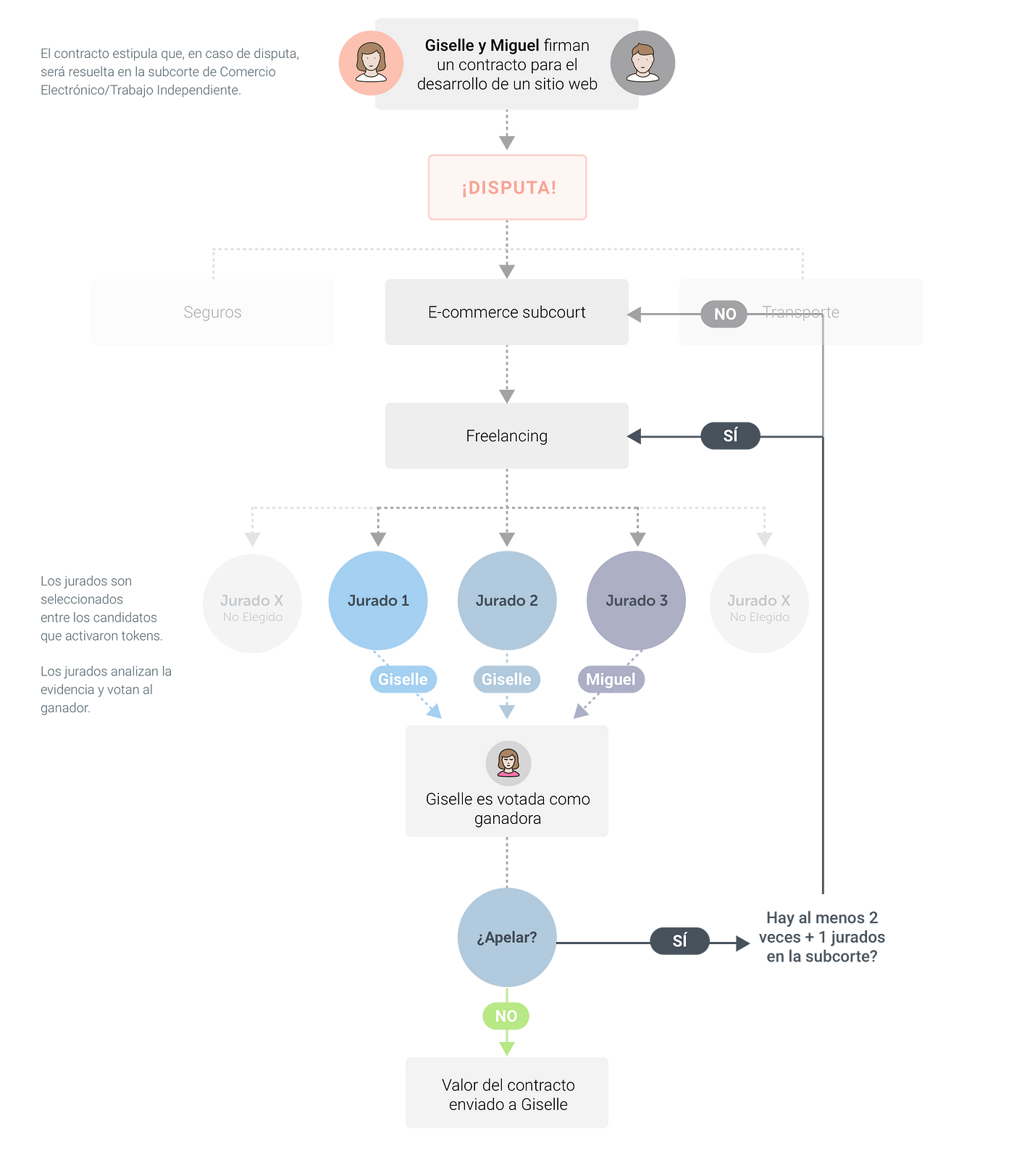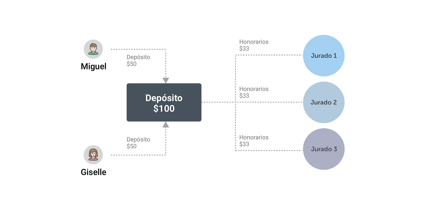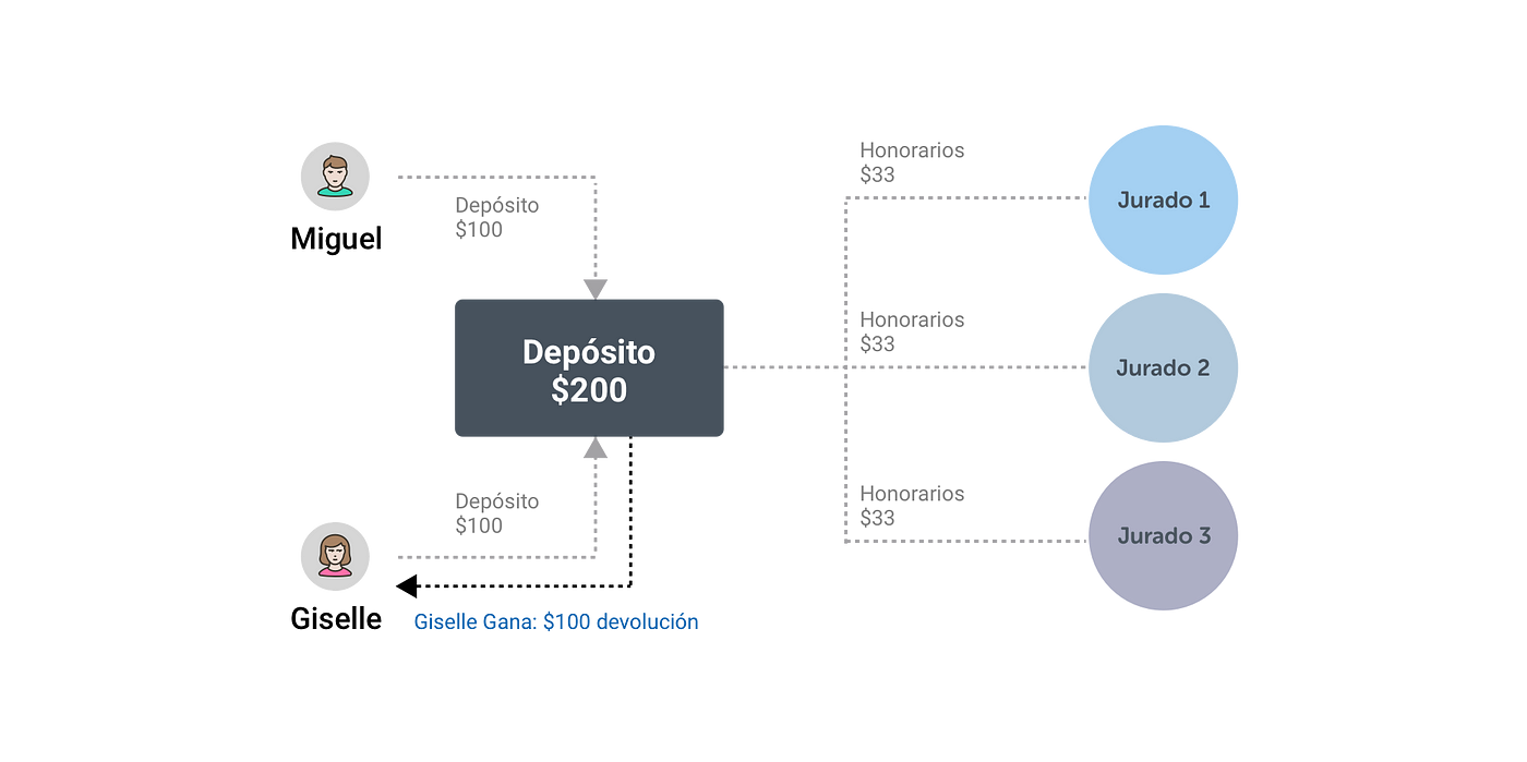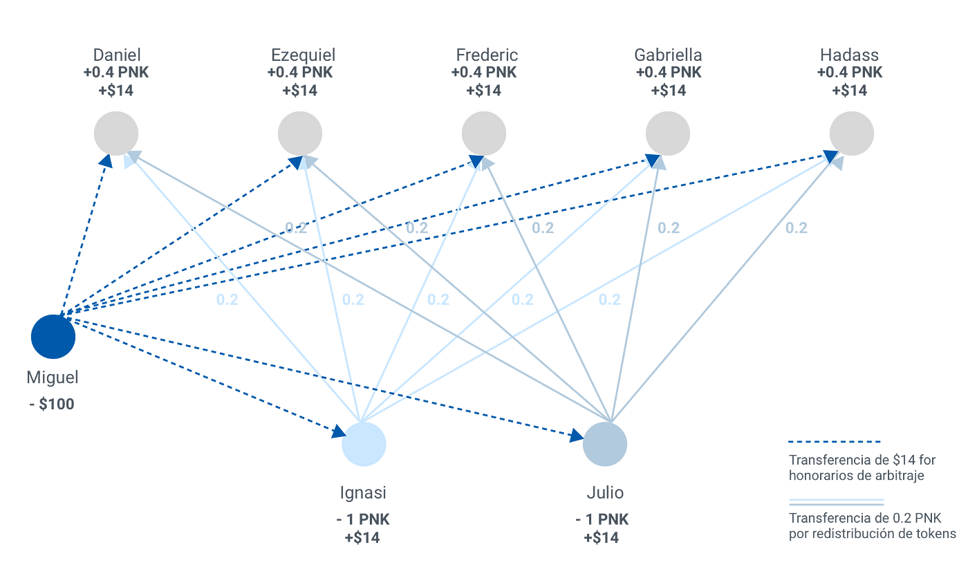 Imaginemos que la disputa entre Giselle y Miguel fue resuelta con 7 jurados. Ignasi y Julio, que votaron de manera diferente a la mayoría, pierden sus tokens. Estos son redistribuidos entre los jurados que votaron de manera coherente. El efecto neto sobre cada jurado dependerá de la diferencia entre el valor de los honorarios ganados y el valor de los tokens perdidos.