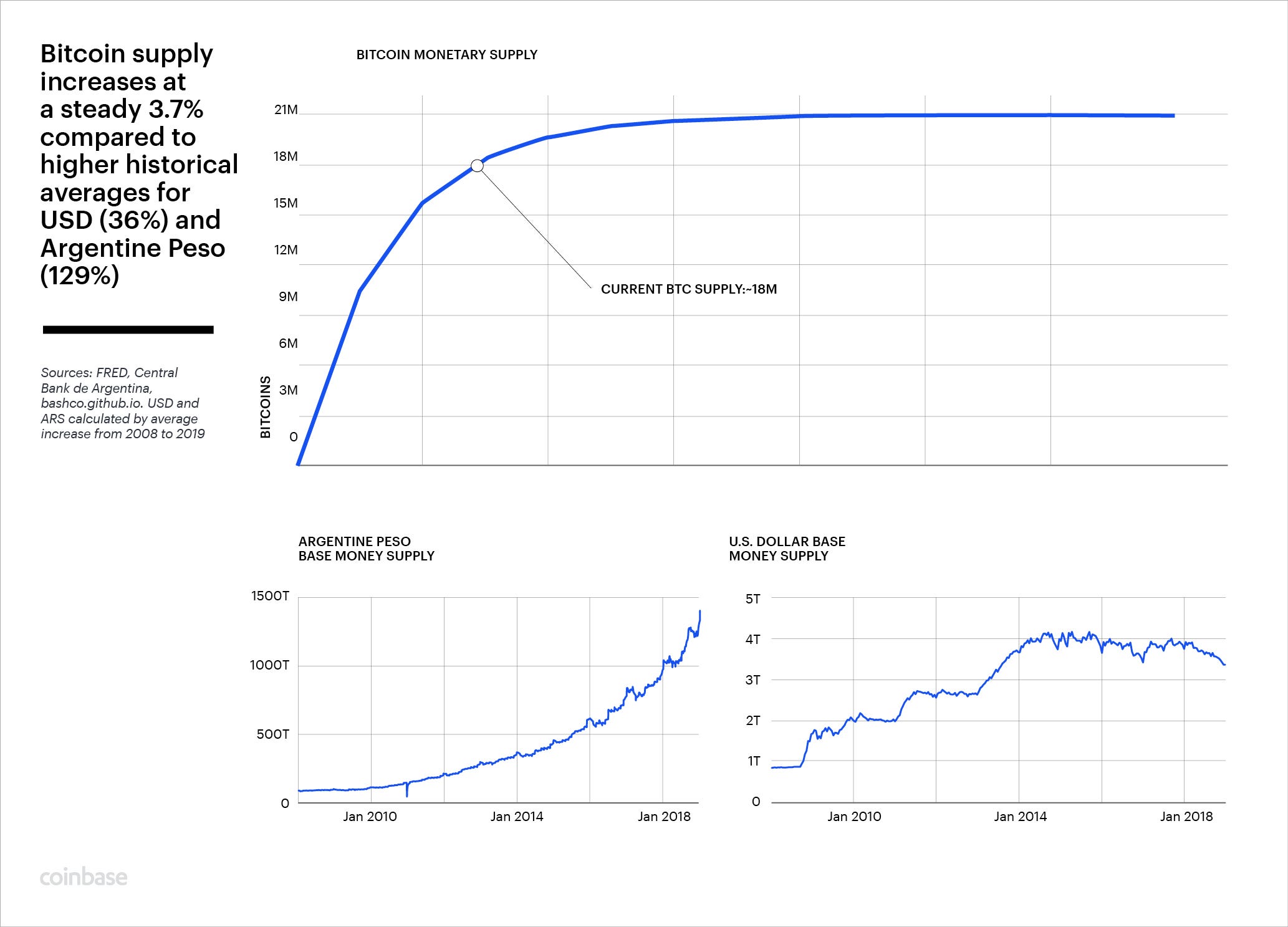Al controlar mediante programación el número de nuevos bitcoins creados, la inflación de la oferta de Bitcoin es predecible y constante. Las monedas fiduciarias, por otro lado, pueden tener suministros muy fluctuantes que son imposibles de predecir. Desde 2008, el aumento promedio de la oferta del dólar estadounidense ha sido del 36% anual y del 129% anual para el asediado peso argentino. En comparación, el aumento anual de la oferta de Bitcoin es actualmente del 3,7% y caerá el próximo año al 1,7%.