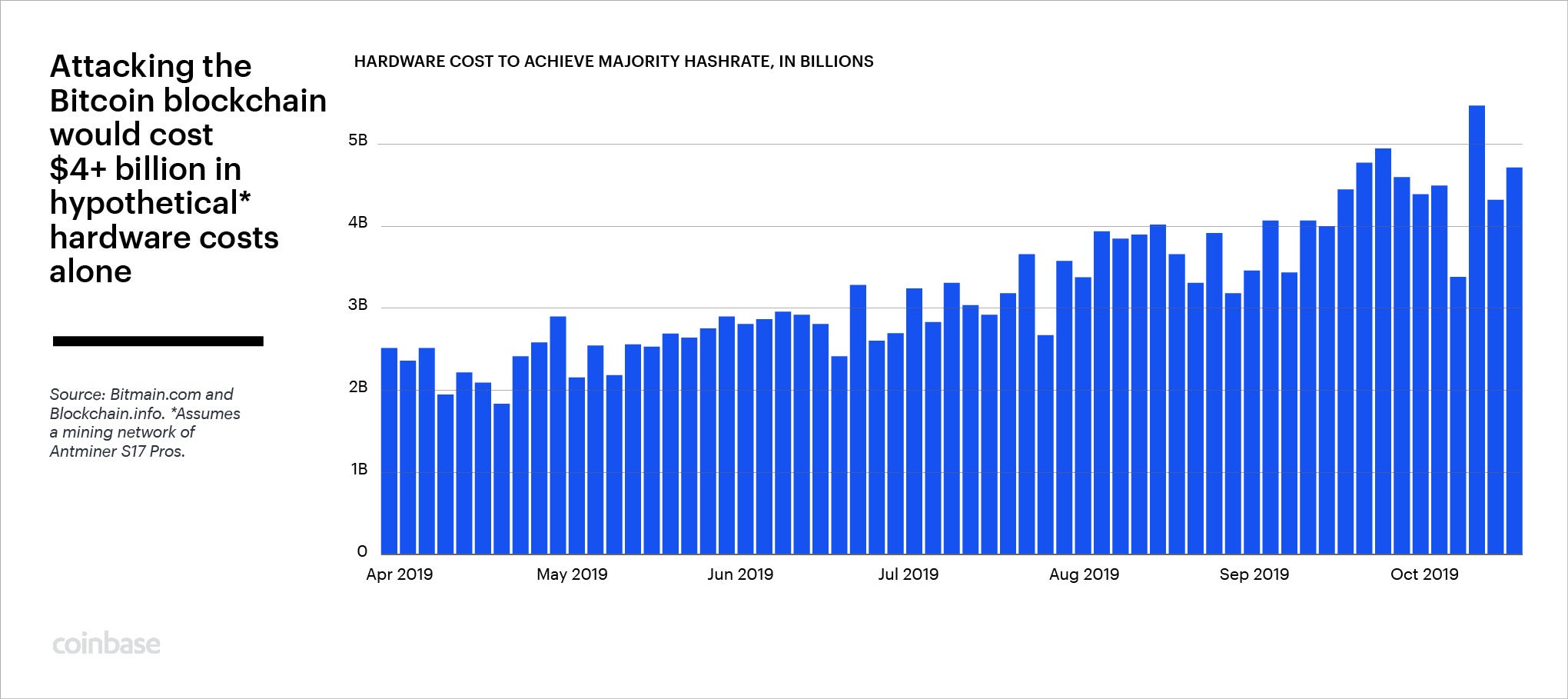 La tasa de hash de Bitcoin es importante porque mide la seguridad de la red. Cuanto mayor sea la tasa de hash, más poder de cómputo se necesita para comprometerla. La tasa de hash de Bitcoin recientemente alcanzó un récord de 108 millones de terahashes por segundo. Bitcoin es, con mucho, la red computacional más grande jamás creada y la cadena de bloques más segura. Esto significa que controlar la mayoría de esa potencia de cómputo requiere una enorme cantidad de hardware informático, hardware que costaría más de $ 4 mil millones comprar directamente. E incluso si alguien tuviera unos pocos miles de millones quemando un agujero en su bolsillo, los costos para adquirir, almacenar y alimentar ese hardware serían exorbitantes.