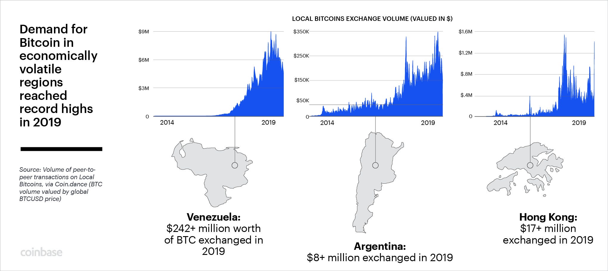En Venezuela, Argentina y Hong Kong, tres regiones que experimentaron una alta volatilidad económica este año, el intercambio de BTC entre pares LocalBitcoins.com experimentó precios premium y un volumen creciente. Las economías de Argentina y Venezuela están siendo sacudidas por la inflación, la corrupción y los controles de capital. Y Hong Kong, que siempre ocupa el puesto número 1 en el Índice de Libertad Económica, actualmente sufre disfunciones políticas y protestas masivas. Desde 2013, los volúmenes en Argentina peso, dólar de Hong Kong y bolívar venezolano, los pares de bitcoins han excedido el valor total de $ 600 mil millones. Recientemente, coincidiendo con el aumento de las tensiones, los volúmenes de bitcoins de Hong Kong también alcanzaron niveles récord.