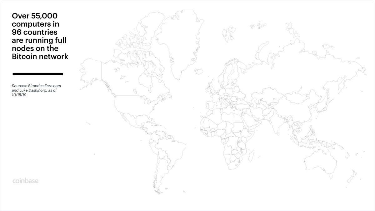Más de 55,000 nodos, esencialmente computadoras que ejecutan el software Bitcoin, están conectadas a la red Bitcoin. Los nodos son la fuente fundamental de la verdad para el libro mayor de Bitcoin y son responsables de registrar y validar las transacciones. Si bien la red de Bitcoin podría funcionar teóricamente en un puñado de computadoras, más nodos aumentan la descentralización y la seguridad. Al permitir que cualquier persona con una computadora y acceso a Internet ejecute un nodo, Bitcoin le permite a cualquier persona, en cualquier lugar, votar en este sistema global.