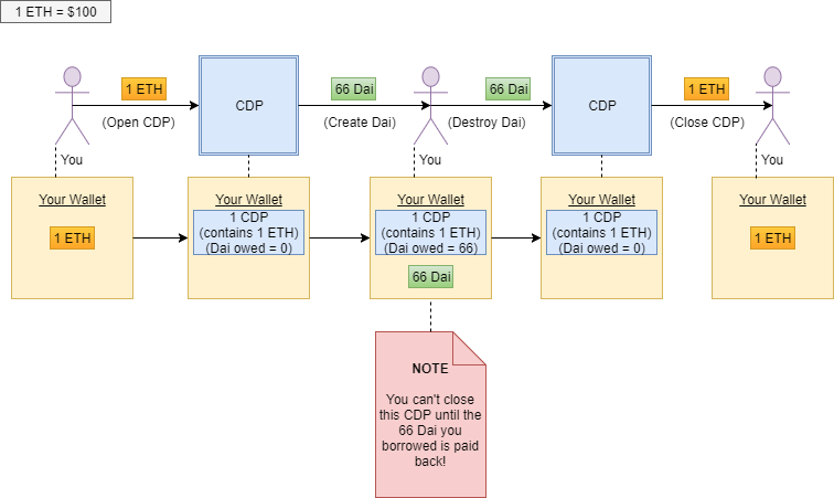 Digamos que el éter vale $ 100 en este momento y la relación de colateralización es del 150%. Si envío 1 ether ($ 100) al contrato inteligente de CDP, ahora puedo crear 66 Dai. Esto significa que, con el valor actual de ether, cada 100 Dai que he creado está respaldado por 1.5 colaterales de ether. En el sistema Maker, no pierde su éter, pero tampoco lo controla más. El éter que envió al CDP está atascado allí hasta que devuelva el 66 Dai (esto destruye el Dai). El siguiente diagrama ayuda a visualizar cómo puede abrir y cerrar un CDP. Intente seguir junto con «su billetera», ya que las acciones se realizan anteriormente.Este diagrama está algo simplificado. Por ejemplo, un CDP realmente no se sienta en su billetera. También elimina un par de pasos que son necesarios para los aspectos más avanzados del sistema, pero que en última instancia son irrelevantes para usted como prestatario de Dai.