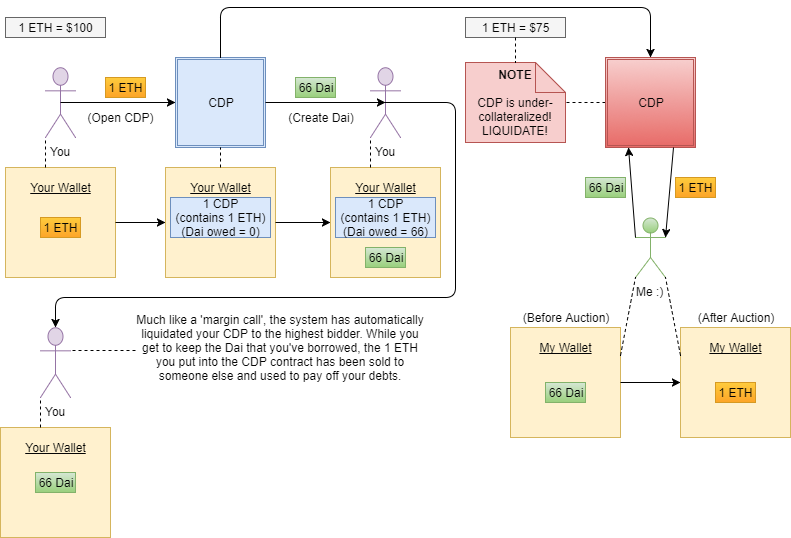 Maker combate esto liquidando los CDP y subastando el éter dentro antes El valor del éter es menor que la cantidad de Dai que está respaldando. Básicamente, si el precio de alimentación en el CDP indica que el valor del éter ha ido por debajo de un cierto umbral (usemos el 125% del Dai creado), entonces el CDP se «liquida» y el éter dentro del CDP se subasta por Dai hasta hay suficiente Dai para pagar lo que se extrajo del CDP. Volvamos al diagrama para ver cómo funciona esto. Como antes, he simplificado algunos de los pasos en aras de la comprensión, hay algunas características adicionales en el sistema que evitan varios ataques de casos extremos.